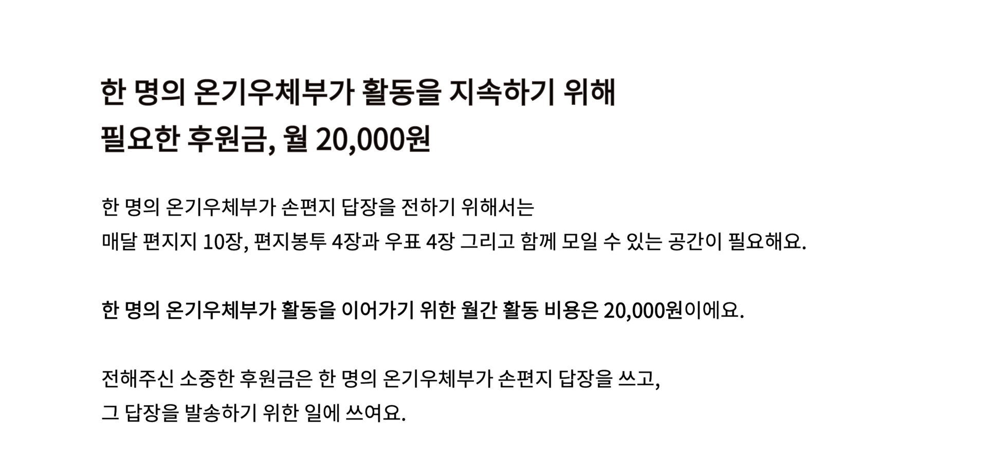 꼭 20,000원이 아니어도 괜찮아요. 5,000원, 10,000원 그 어떤 금액이든, 소중히 함께해 주시는 것만으로
