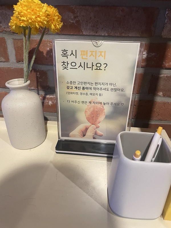 신기한 마음에 나도 한번 고민을 써서 우편함에 넣어보았다. 평소 하는 고민이나 걱정들을 적어서 넣으면 되는데, 익명성이 보장되다 보니 주변 지인에게는 하지 못할 솔직한 이야기들을 할 수 있다는 점이 참 좋았다.