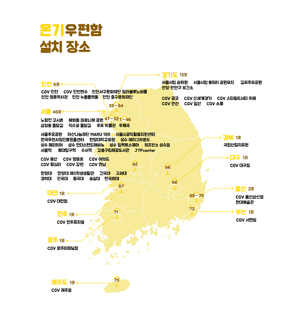 온기우편함은 전국 10개 지역(서울, 경기, 인천, 울산, 부산, 전주, 대구, 광주, 대전, 제주)에 총 73곳이 설치되어있다. 구체적인 설치 장소는 아래 사진과 온기우편함 누리집에서 확인할 수 있다.